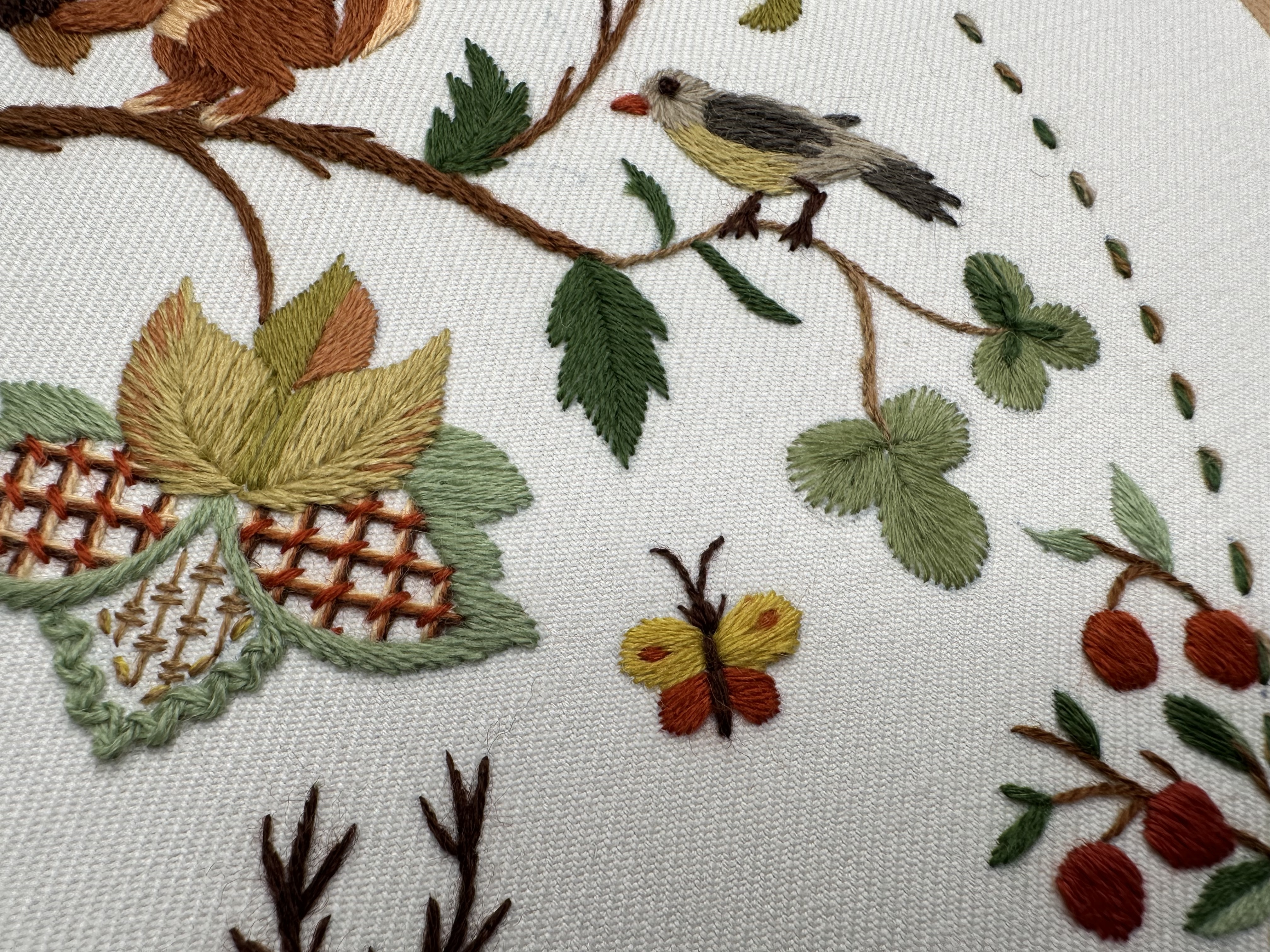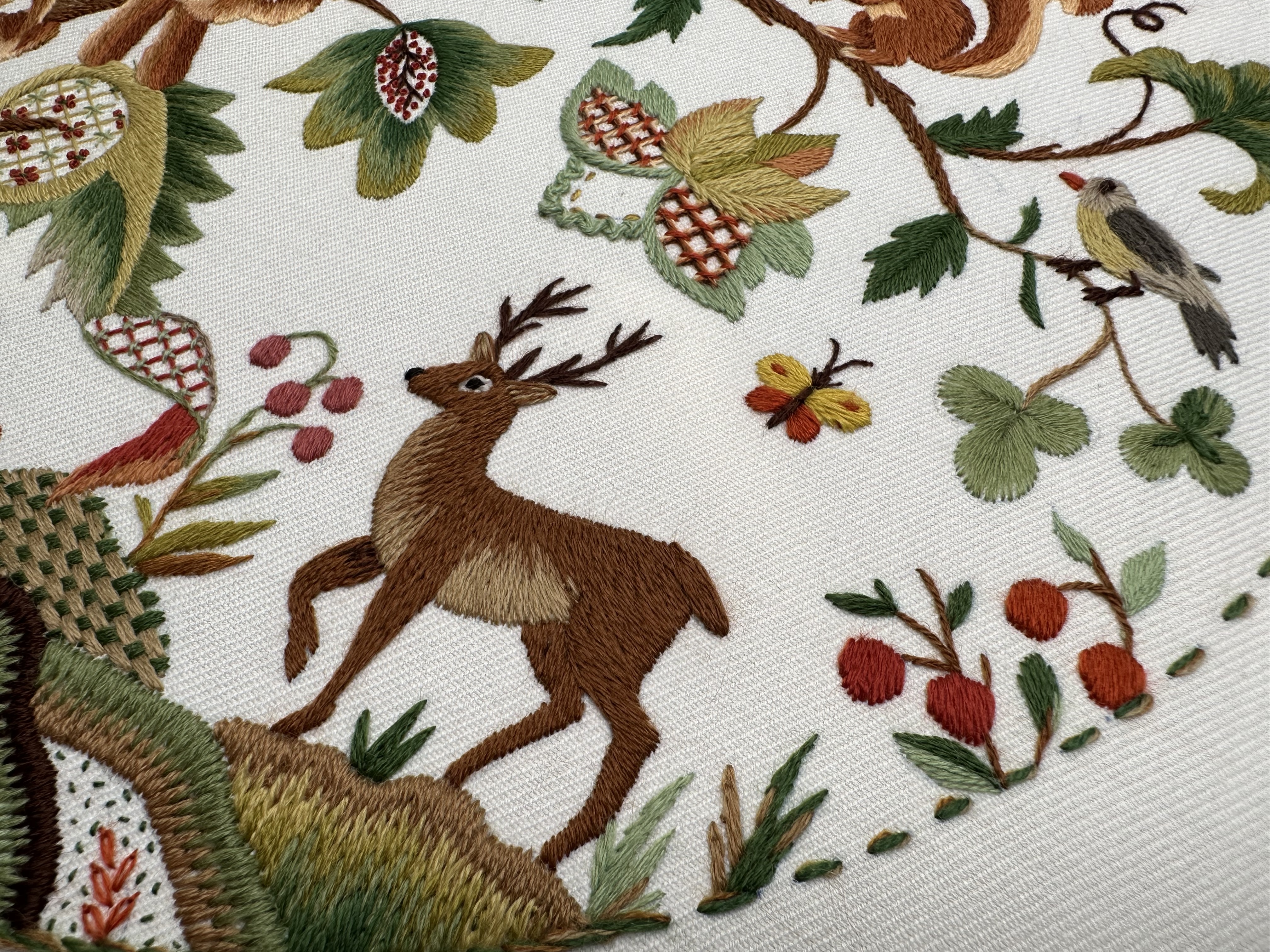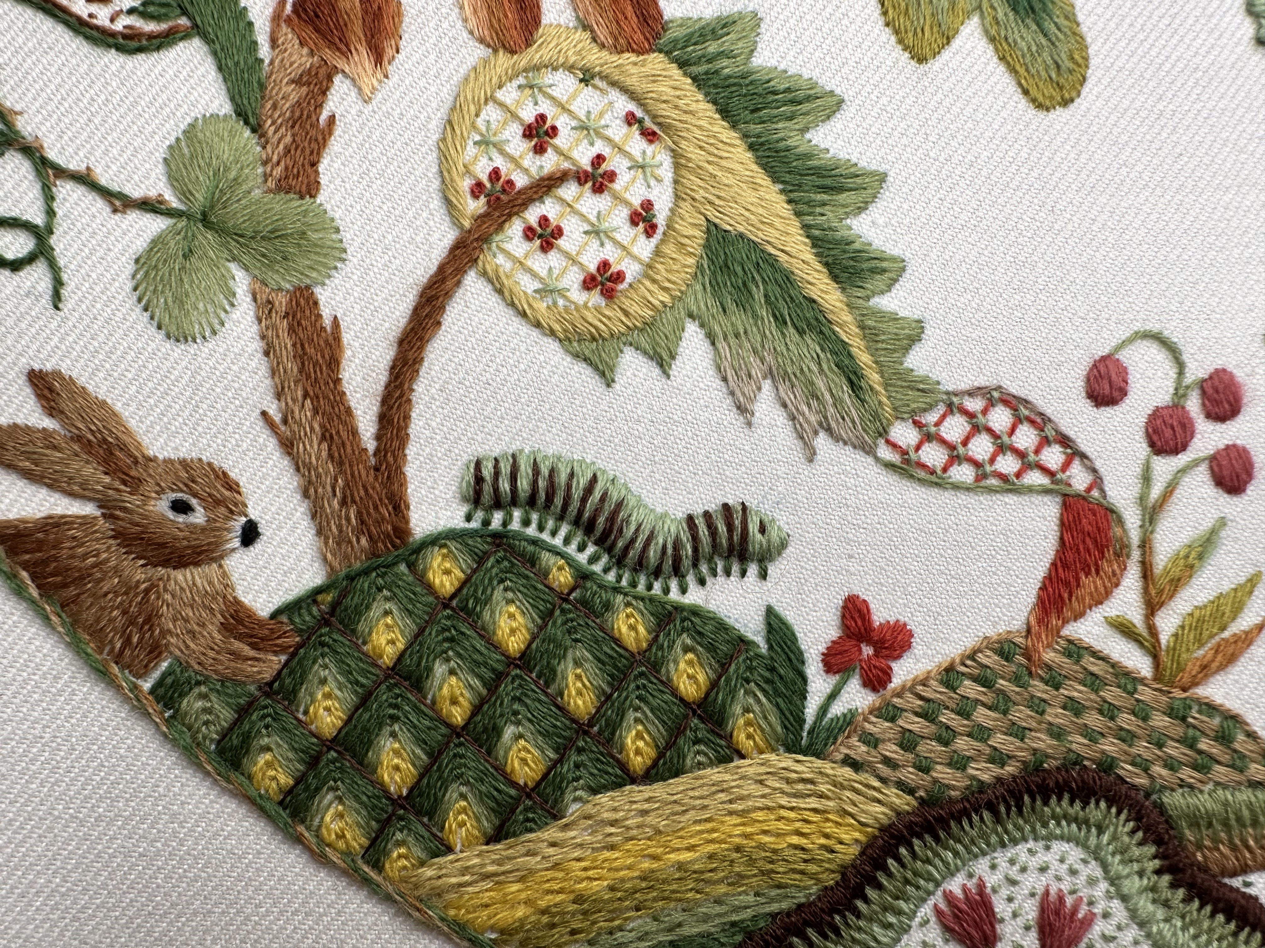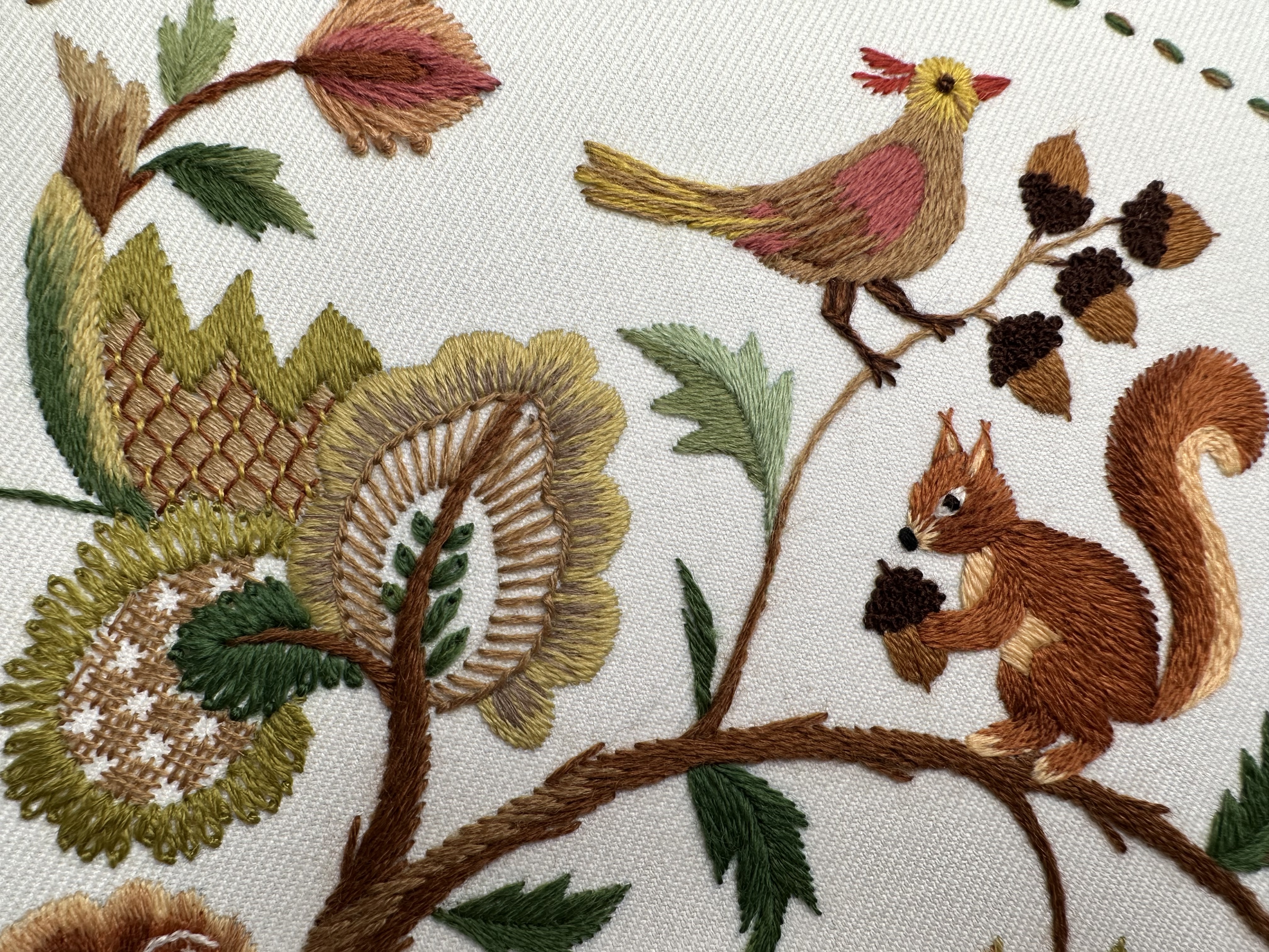 Со временем стиль якобинской вышивки обрастал новыми сюжетами, материалами и приемами, но истоки этой вышивки — классика райского сада в шерстяном исполнении остаётся в сердце.